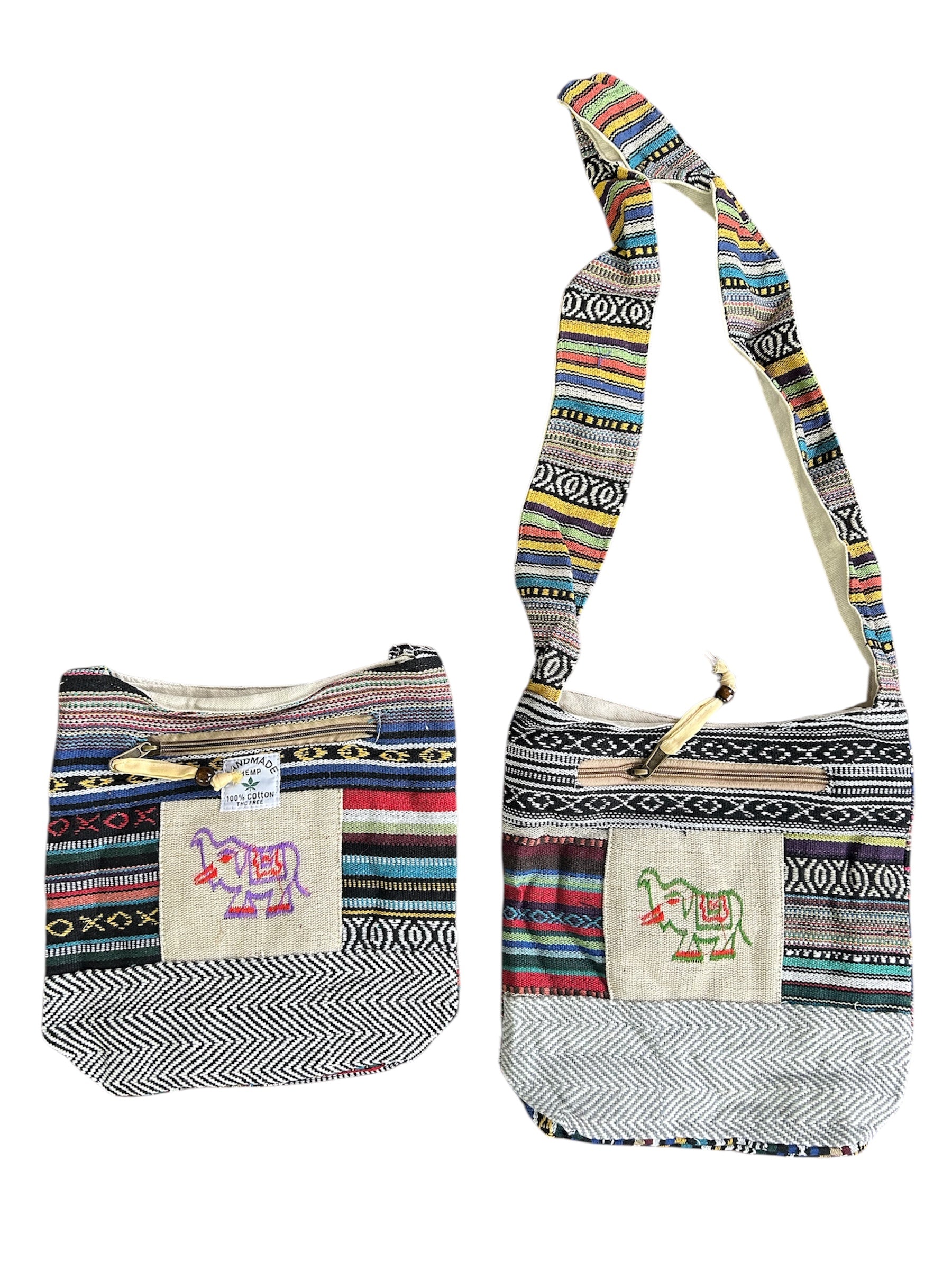 Handmade bag, shoulder or crossbody. Symbol for 'good luck - elephant with trunk up, or 'cosmic peace - Ohm'. Strap is approximately 40 inches , bag is approximately 11 inches long and 10 inches wide. Bag has 2 zippered sections. Each piece is different as they are handmade, only in assorted colors.