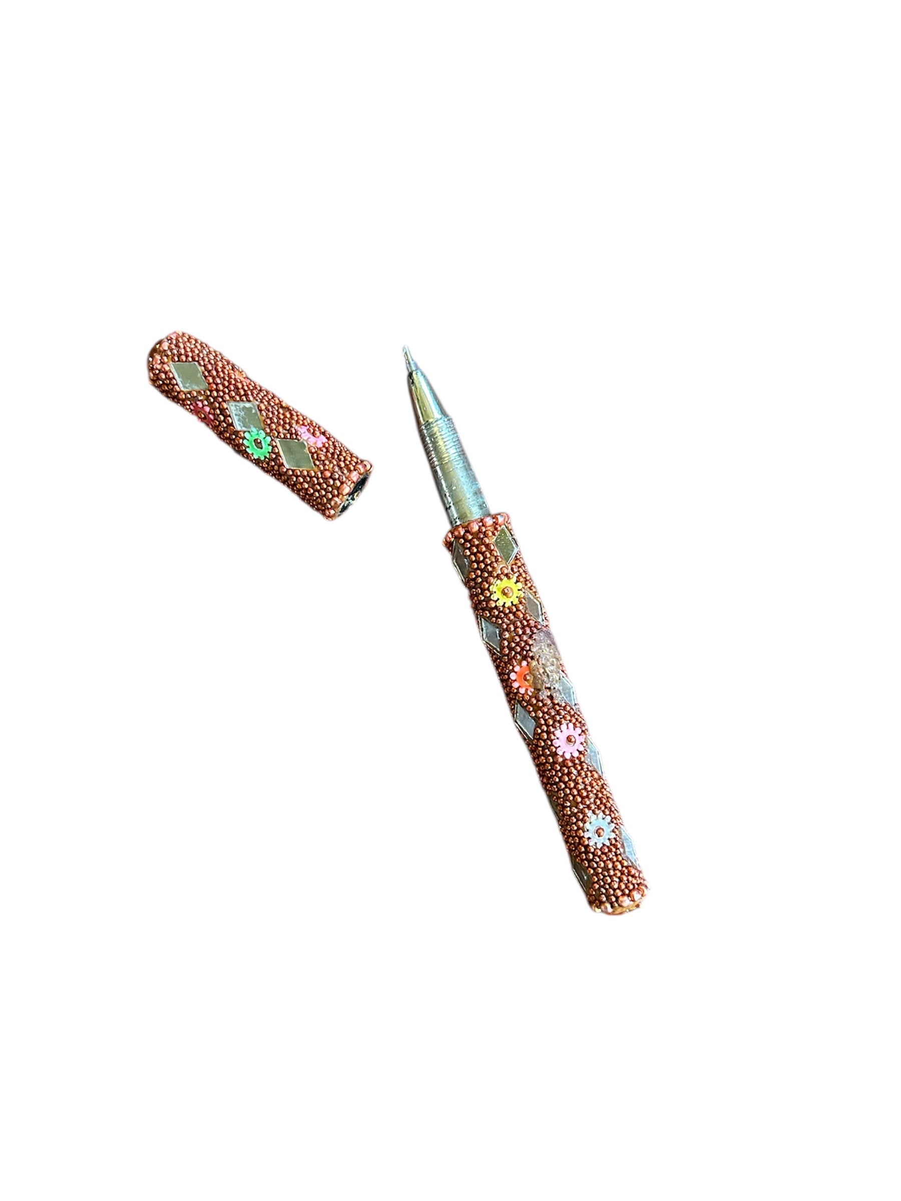 Handmade pen, beaded and small mirrors. Easy to change refills. Assorted colors only.